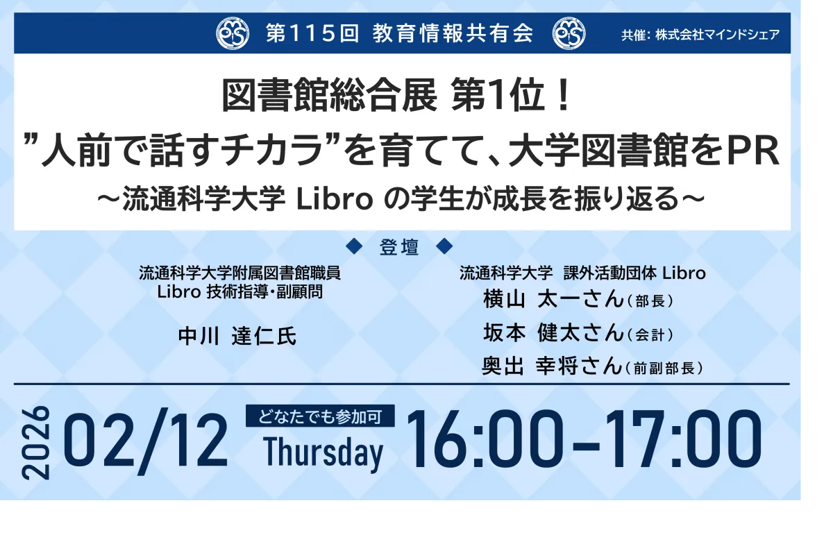 教育の未来を担う学生たちが集まる第115回教育情報共有会が、流通科学大学にて開催されます。このイベントのテーマは「図書館総合展 第1位!人前で話す力を育てて、大学図書館をPR」です。この会では、流通科学大学附属図書館の職員である中川達仁氏と、学生団体「Libro」のメンバーである横山太一さん、坂本健太さん、奥出幸将さんが登壇し、それぞれの経験や学びを共有します。