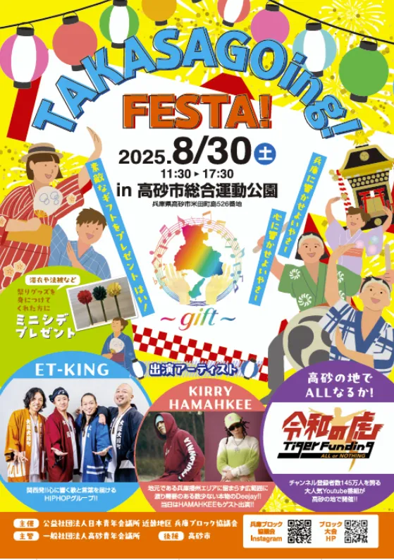 - - フェスタ:高砂市野球場にて、12:00から17:30までステージイベントを行います。また、野球場前では11:30から16:00までブースイベントも開催。