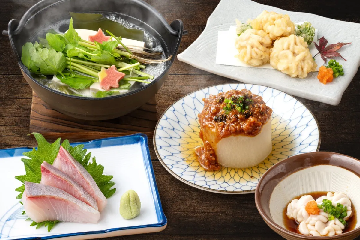1月の旬メニューには、脂の乗った「寒ぶり」の刺身や「鱈の白子」といった海の幸と、根付きセリや大根などの野菜を組み合わせた全11品が取り揃えられています。特に寒ぶりは、米川水産から仕入れた新鮮な素材を使用し、板前が丁寧におろした絶品の刺身です。その甘みととろける食感は、まさに冬の味覚を象徴しています。