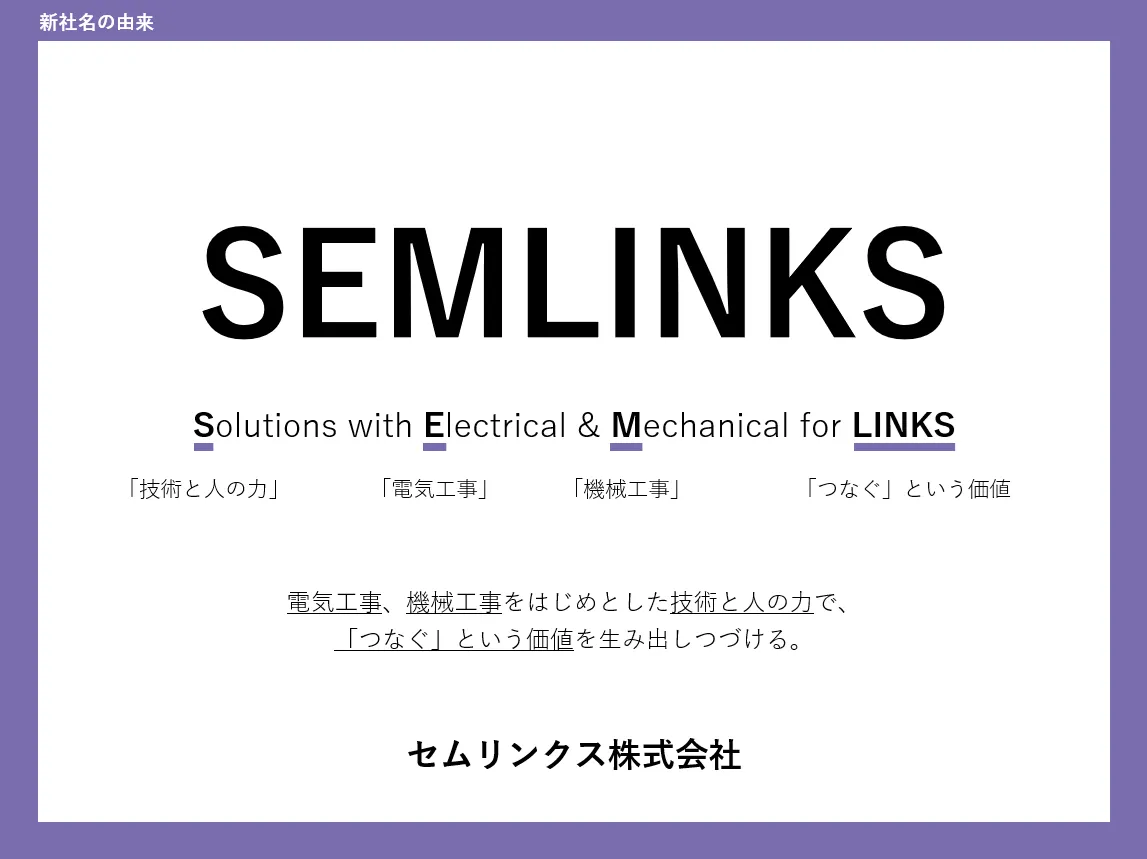 新社名「セムリンクス」には、「電気工事、機械工事をはじめとした技術と人の力で、つなぐ」という価値を生み出し続けるという想いが込められています。この名前は、これまで培ってきた技術力と人的ネットワークを駆使して社会に貢献し続けるという決意の表れです。これからはこの新たな社名のもと、一層のサービス向上と新しい価値創造に努めていくという明確なビジョンを持っています。
