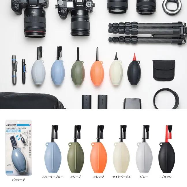 カメラやレンズの手入れは、映像のクオリティに直結する大切な作業です。そんなクリーニング作業をよりスムーズに行えるアイテムが、ハクバ写真産業から登場しました。新発売される「シリコンブロアーマルチノズル」は、用途に応じてノズルが交換可能なシリコン製ブロアーです。色展開も豊富で、スモーキーブルー、オリーブ、オレンジ、ライトベージュ、グレー、ブラックの6色から選べます。