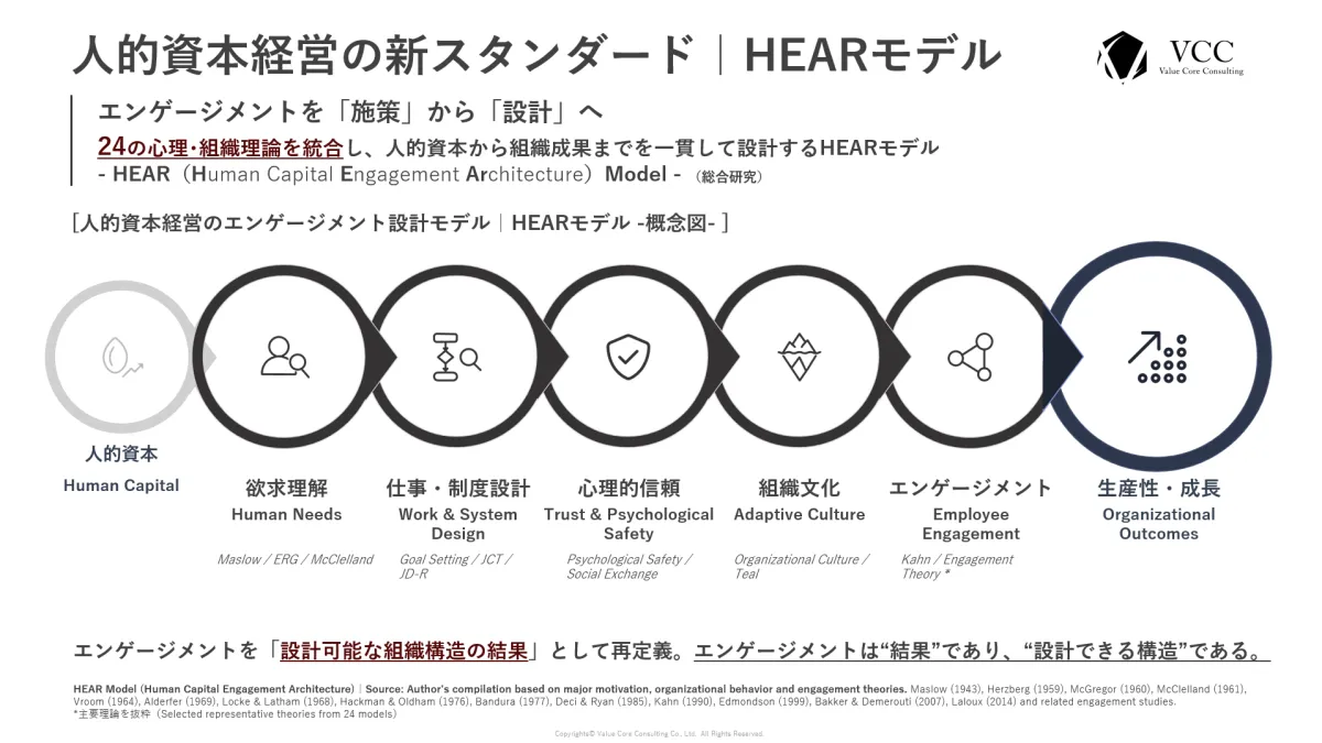株式会社バリュー・コア・コンサルティング(VCC)がこの度公開した、人的資本を重視した新しい組織設計モデル「HEAR(Human Capital Engagement Architecture)モデル」が、企業のエンゲージメントや生産性の向上に新たな視点をもたらしています。HEARモデルは、組織行動論や心理学、マネジメント研究における24の理論を統合しており、人材を中心とした経営をサポートするフレームワークです。.