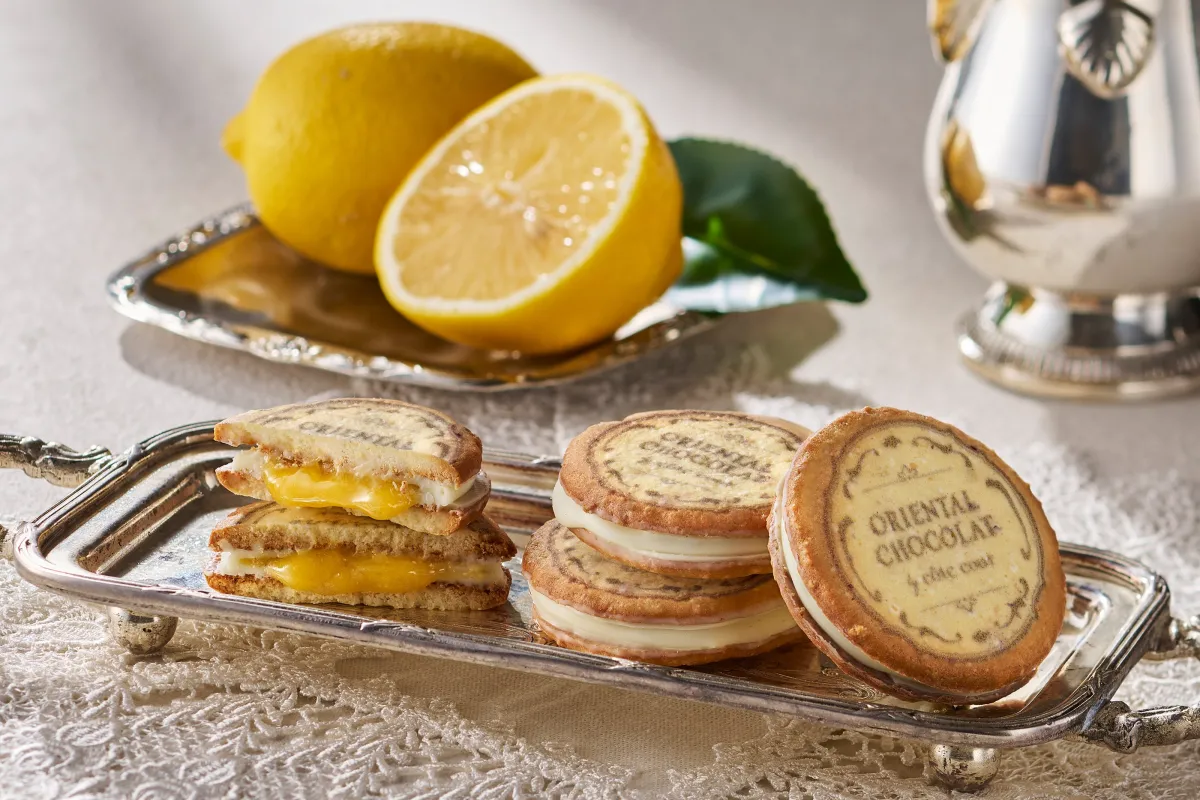 新作の『オリエンタルショコラサンド<レモン>』は、瀬戸内産のレモン果汁を使用したペーストをホワイトチョコレートでコーティングし、ヘーゼルナッツパウダーを混ぜ込んだクッキーでサンドしています。このお菓子は、甘味と酸味の絶妙なバランスを楽しむことができ、特に今の時期にはぴったりの爽やかな味わいです。