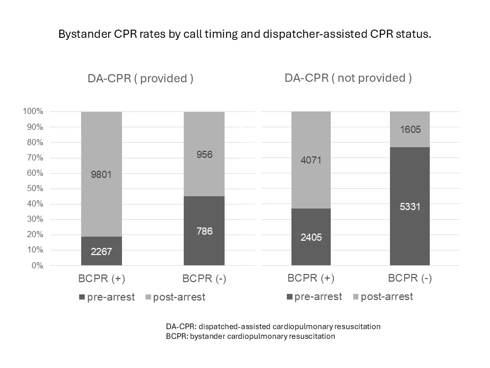 研究は、2017年から2022年までの全国データをもとに、65歳以上の介護施設入所者で心停止が目撃された27,222件の症例を対象としています。心停止が発生する前に通報された事例(pre-arrest call)と、心停止後に通報された事例(post-arrest call)を比較し、バイスタンダーによる心肺蘇生の実施率および1か月後の生存率がどのように異なるかを分析しました。