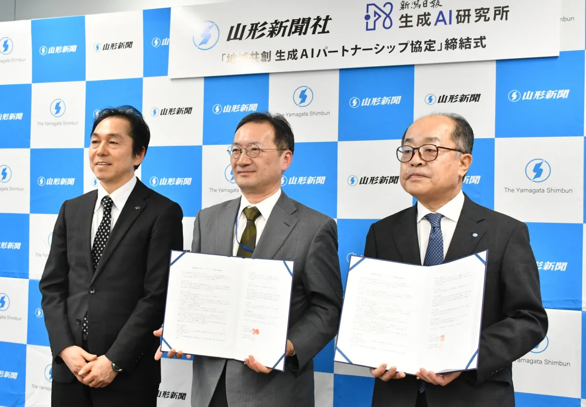 2023年10月2日、山形新聞社と新潟日報生成AI研究所の両社が、山形市にて「地域共創 生成AIパートナーシップ協定」を正式に締結した。これにより、両社は地域特性を反映させた生成AIの活用を進め、デジタルイノベーションを地域社会にもたらすことを目指す。