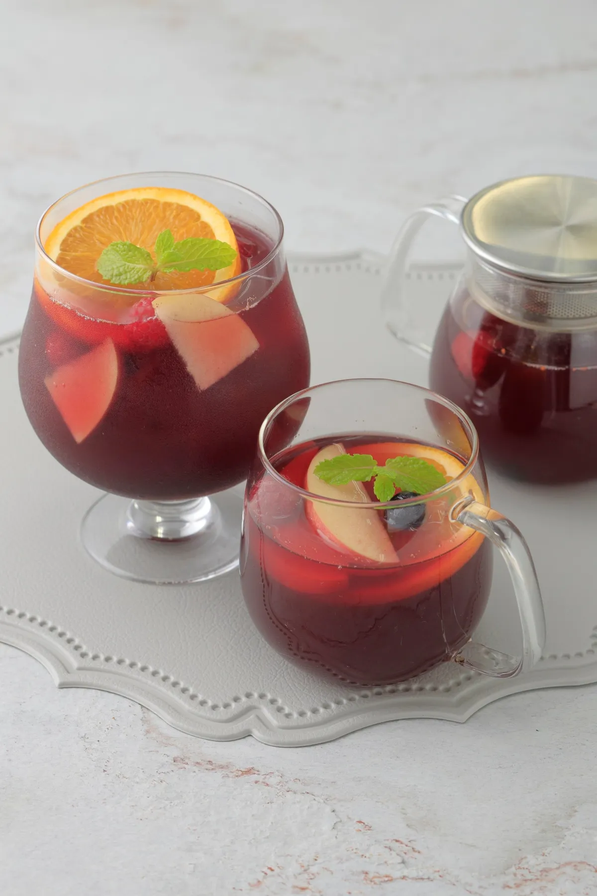 このフルーツティーは、「芳醇アップル」の紅茶をベースに、濃厚なコンコード種とカベルネ・ソーヴィニヨン種の赤葡萄ジュース、さらにりんご、オレンジ、ラズベリー、ブルーベリーの4種の果実が調和した絶妙な一杯です。セイロンシナモンとクローブの香りがほんのり漂い、深みのある味わいが魅力です。