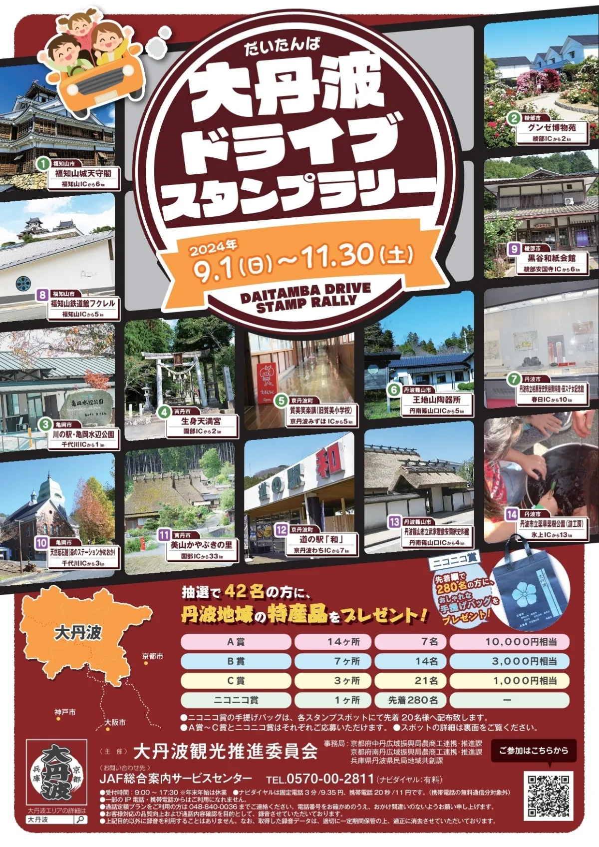 このスタンプラリーは、大丹波観光推進委員会を主催として、福知山市や綾部市など、京都と兵庫の7つの市町が協力して実施されます。観光協会や商工会も支援し、地域全体で盛り上げるイベントになっています。