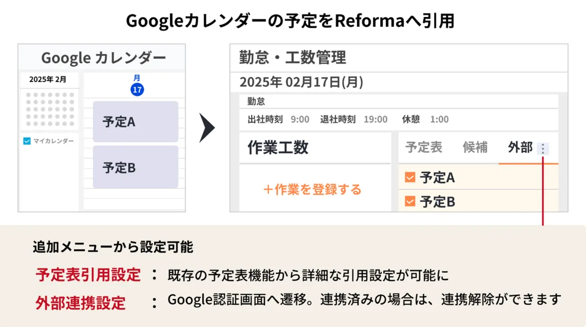 この「Googleカレンダー連携機能」では、Googleカレンダーに登録された予定情報がReformaの工数登録画面に表示されるため、ユーザーは簡単にこれらの情報を引用して工数を登録することが可能です。これにより、従来の工数入力作業が大幅に簡略化され、効率的な作業が実現します。