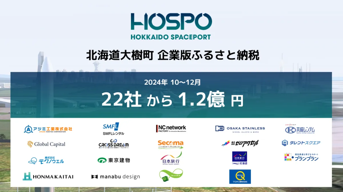 北海道の大樹町では、商業宇宙港「北海道スペースポート(HOSPO)」プロジェクトが進行中です。このプロジェクトにおいて、町長の黒川豊氏が指導する大樹町とSPACE COTAN株式会社の協力の下、2024年10月から12月にかけて、国内外の22社から企業版ふるさと納税を通じて合計1億2,090万円の寄付が集まりました。この寄付金は、宇宙港のさらなる発展を支える重要な資金となります。