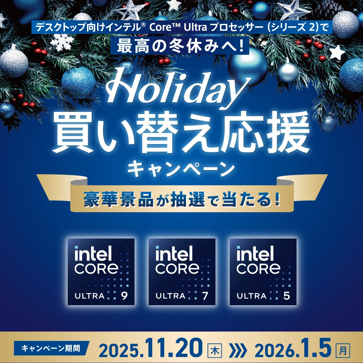 インテル株式会社は、デスクトップ向けの最新『インテル® Core™ Ultra プロセッサー (シリーズ2)』と共に、特別な冬休みキャンペーンを発表しました。本キャンペーンは、2025年11月20日から2026年1月5日まで実施され、対象製品を購入することで、豪華な景品を手に入れるチャンスがあります。