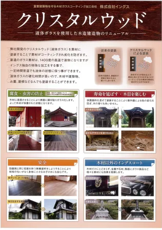 『クリスタルウッド』は、木材に塗装することで劣化を防ぎ、その寿命を延ばすことができる画期的なコーティング剤です。使用する素材は水性無機系で、有機溶剤を含まないため、その安全性は非常に高いです。また、不燃性であるため、安心して使用することができます。