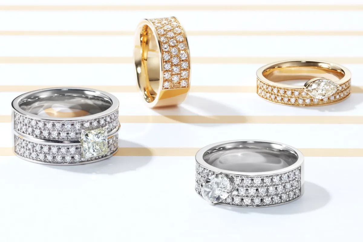 本コレクションには、プレーンなバンドリングとソリテールリングの2タイプが用意されています。バンドリングは、2列のダイヤモンドで構成された“2Row”と、3列の“3Row”があり、どちらも引っ掛かりのない滑らかな仕立てで心地よい装着感を提供します。また、重ねづけでも美しい調和が楽しめます。