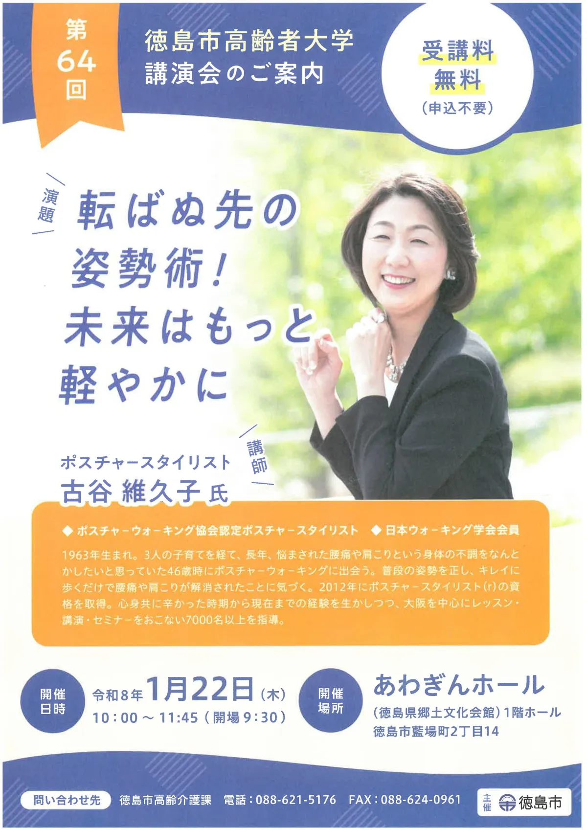 今回の講師は、ポスチャースタイリストの古谷維久子さん。演題は「転ばぬ先の姿勢術!未来はもっと軽やかに」と題して、姿勢改善の重要性と日常生活における実践方法についてお話しされます。
