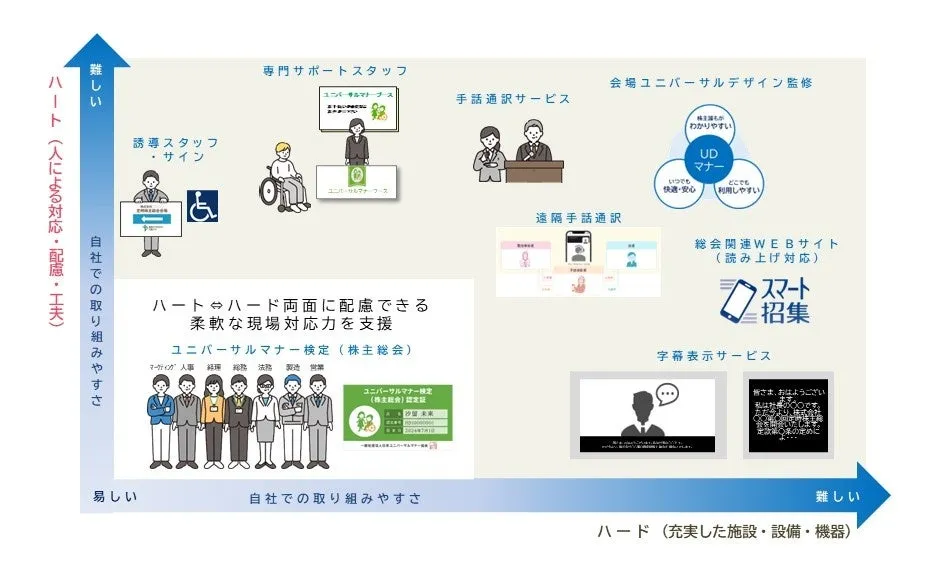 - - ユニバーサルマナー検定: 総会担当者が必要な知識とマインドを学ぶことで、参加するすべての方に配慮した運営が可能となります。