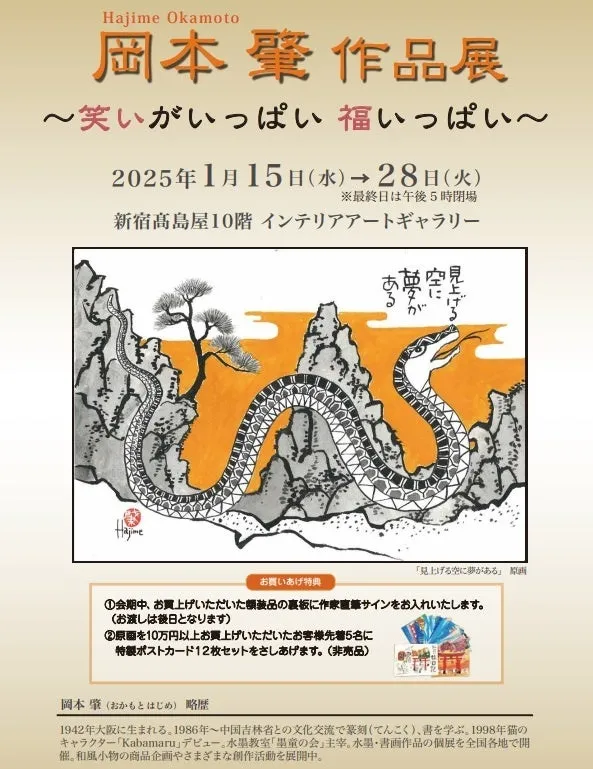 2025年1月15日から1月28日まで、新宿高島屋にて『岡本肇 作品展~笑いがいっぱい 福いっぱい~』が開催されます。作品そのものがパワースポットと称される岡本肇氏の作品が、訪れる人々に福を招くと話題です。