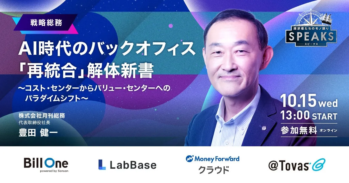 2025年10月15日、株式会社ニューピークスが主催する「SPEAKS バックオフィス経営変革サミット」が開催されます。オンラインでの配信で、参加者に対して多彩なセッションが用意されており、特に注目されるのが株式会社月刊総務の代表取締役社長豊田健一氏による基調講演です。