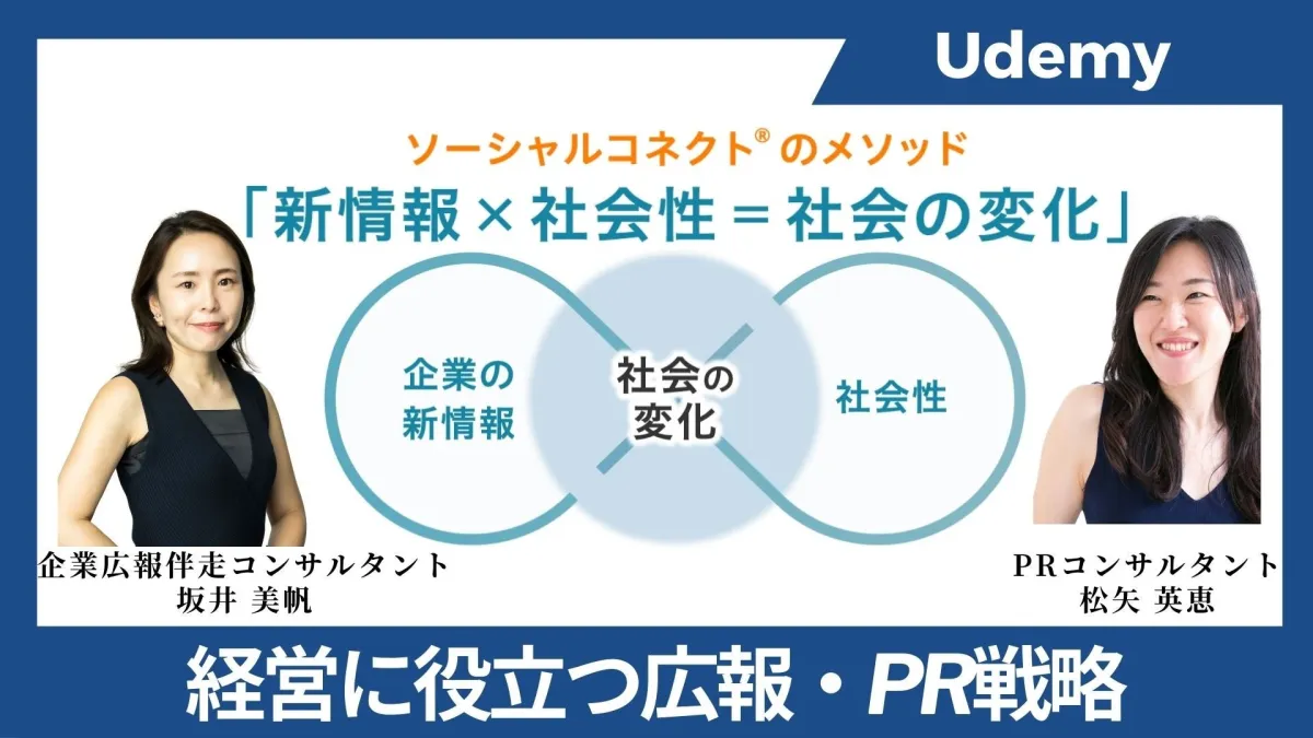 松矢英恵と坂井美帆、二人のPRコンサルタントが開発した新たなPRメソッド「ソーシャルコネクト®」。これを基にした新講座「経営に役立つ広報・PR戦略」が、2025年4月22日にオンラインプラットフォームUdemyで開講されます。この講座は、企業が社会との接点を作り、情報を効果的に発信する方法を学ぶ機会を提供しています。