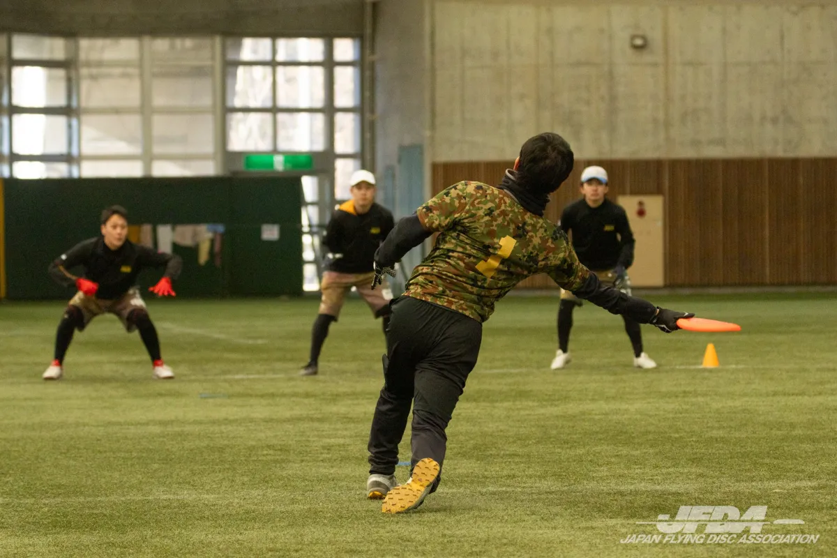 ガッツは各チーム5人から構成され、対面で向かい合う形式で行います。オフェンスチームの選手がディスクを投げ、相手のスコアリングゾーンにキャッチさせることで得点を獲得します。ディスクを投げる際は、ファールラインの手前から投げなければなりません。特に女子はスコアリングゾーンの距離が短く設定されており、競技は男女で異なった戦略が求められることも特徴の一つです。