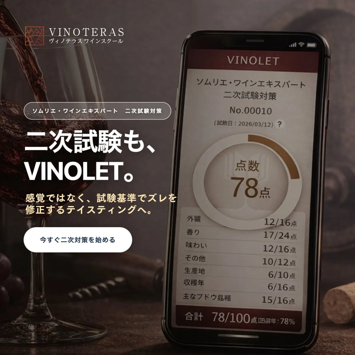 ワイン教育を提供するヴィノテラスが、業界初の試みとして、ソムリエ及びワインエキスパートの二次試験対策アプリ「VINOLET」に新機能を追加しました。この新機能は、過去の試験データをもとに開発されたテイスティング機能で、利用者が実際にワインをテイスティングしながら学習を進められるように設計されています。