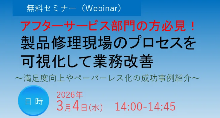 日本のものづくり業界の一端を支えるティアックシステムソリューションズ株式会社は、2026年3月4日(水)に「製品修理現場のプロセスを可視化して業務改善~満足度向上やペーパーレス化の成功事例紹介~」と題した無料ウェビナーを開催します。このイベントはアフターサービス部門に関わる方に向けたもので、製品修理業務の改善に役立つ情報を提供することを目的としています。