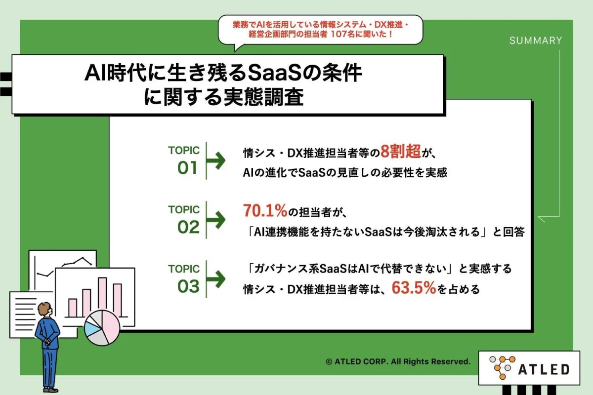 最近の調査によると、AIの進化がSaaS(ソフトウェア・アズ・ア・サービス)に与える影響について、非常に興味深い結論が得られました。株式会社エイトレッドが実施したこの調査は、106名の情報システムやDX推進部門の担当者を対象に行われ、AI時代に生き残るSaaSの条件を探るものでした。結果、80%以上がAIによるSaaSの見直しの必要性を感じており、その影響は企業の業務運営に大きく関わっています。