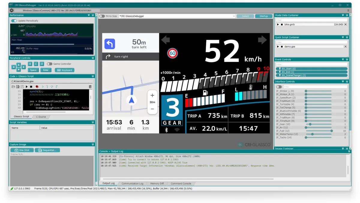 「CRI Glassco」は、モビリティのデジタルメーターを開発・制御するためのソフトウェアです。このツールは、デジタルメーターのモデルを製作する機能と、実機で動作するランタイムライブラリを組み合わせており、デザイナーが作成したモデルを即座に確認できるという特長があります。