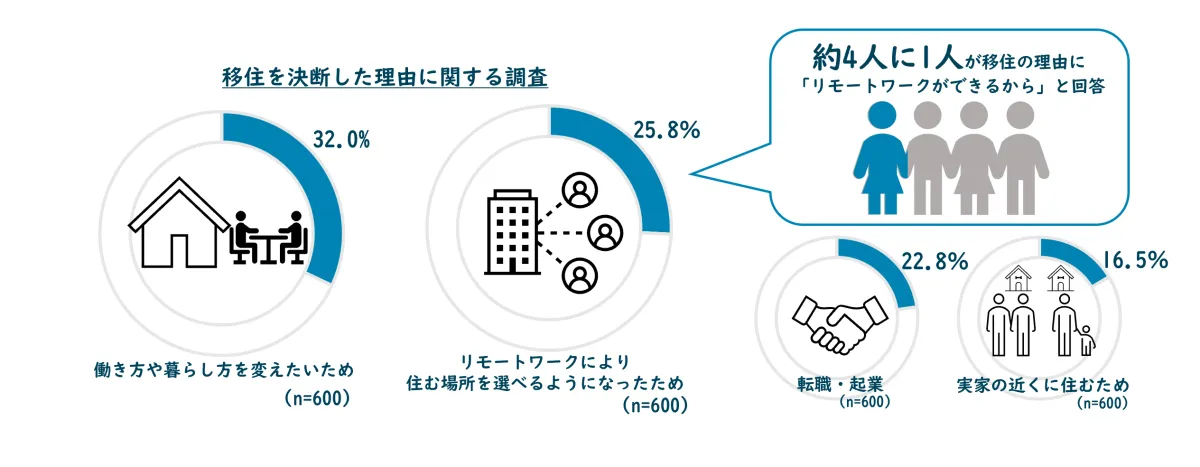 移住を決めた理由に最も多く挙げられたのは、「働き方や暮らし方を変えたいという希望」です。約32%の人がこの理由を選び、特にリモートワークの普及が要因として強調されています。実際、25.8%の人が「リモートワークができるから」という理由で移住を決意しました。このような変化は、仕事に縛られずに住む場所を選ぶ自由度を高め、多くの人々が自分らしい生活を求める結果となったと言えます。