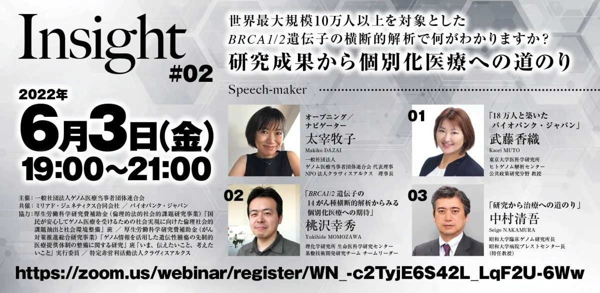 2022年6月3日(金)、ゲノム医療に特化したセミナー「Insight#02」がオンラインで開催されます。このイベントは、一般社団法人ゲノム医療当事者団体連合会が主催し、BRCA1/2遺伝子に関連する最新の研究結果を発表します。具体的には、東アジアにおける特定のがん種に対する遺伝子解析がテーマとなります。