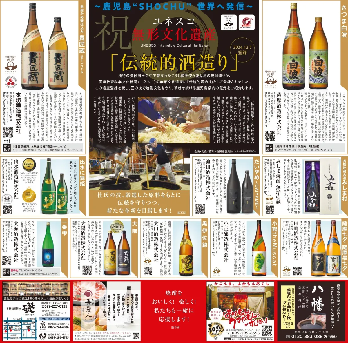 この文化遺産の登録を祝い、南日本新聞社は鹿児島県内の蔵元と、彼らを応援する飲食店を特集した広告企画を12月25日付の朝刊に掲載しました。100を超える蔵元がある鹿児島県では、それぞれの蔵元が地元の素材や独自の製造技術を用い、人気の焼酎を生み出しています。各蔵自慢の特選品がそろっているため、文化を体験しながら自分のお気に入りの焼酎を見つける楽しさも広がります。