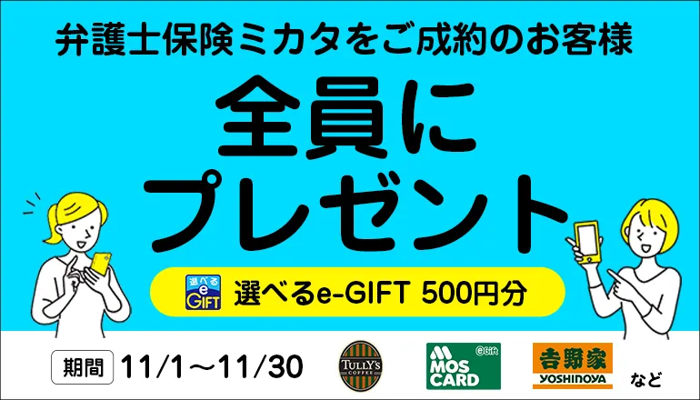 このように、11月は「弁護士保険ミカタ」との契約を通じて法的トラブルへの備えを強化しつつ、500円のe-GIFTもゲットする良いチャンスです。法律問題に対して不安を抱いている方は、ぜひこの機会を活用し、自分の身を守るための一歩を踏み出してみてはいかがでしょうか?