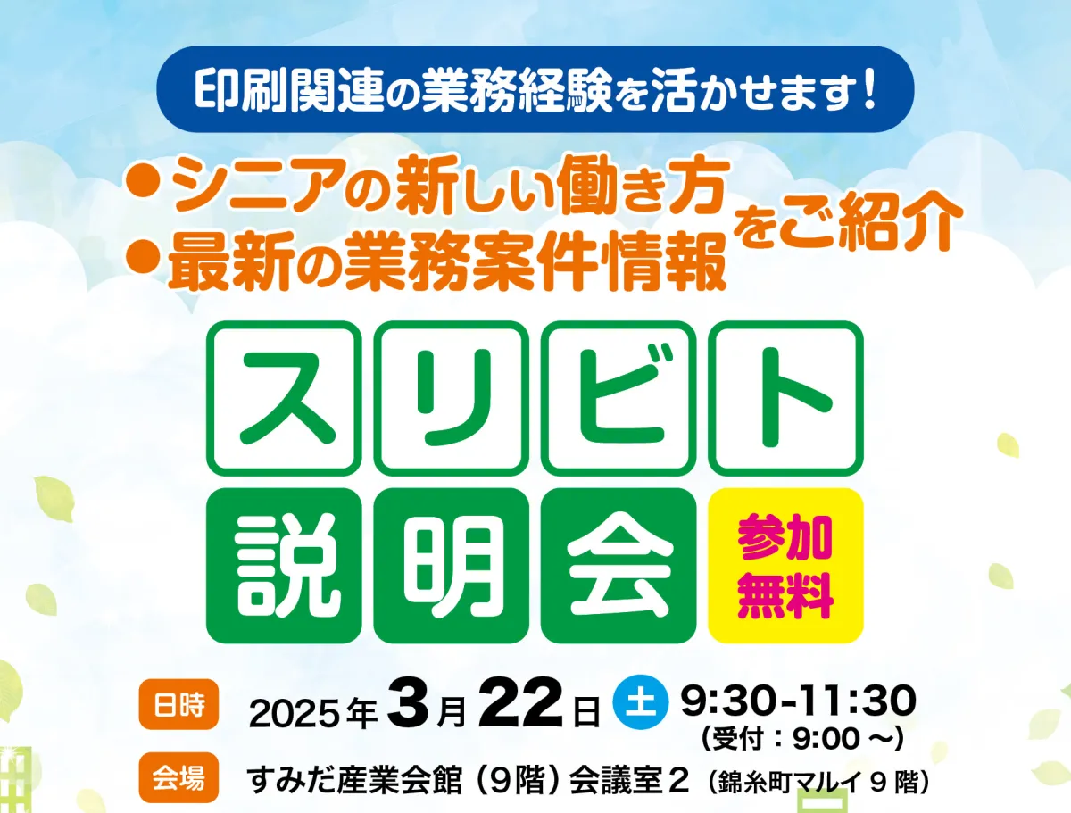 この説明会では、印刷業界の現状や、シニア層が持つべき知識とスキルを身につけるための具体的な手段が紹介される予定です。特に、長年印刷業界で培った技術や経験を新たに活用する方法についての情報が得られる貴重な機会となります。