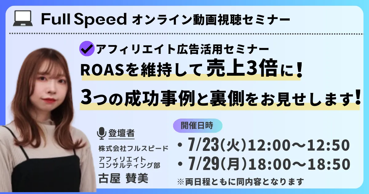 株式会社フルスピードは、アフィリエイト広告活用セミナー「ROASを維持し売上3倍に!3つの成功事例と裏側をお見せします!」をオンライン動画視聴形式で開催します。