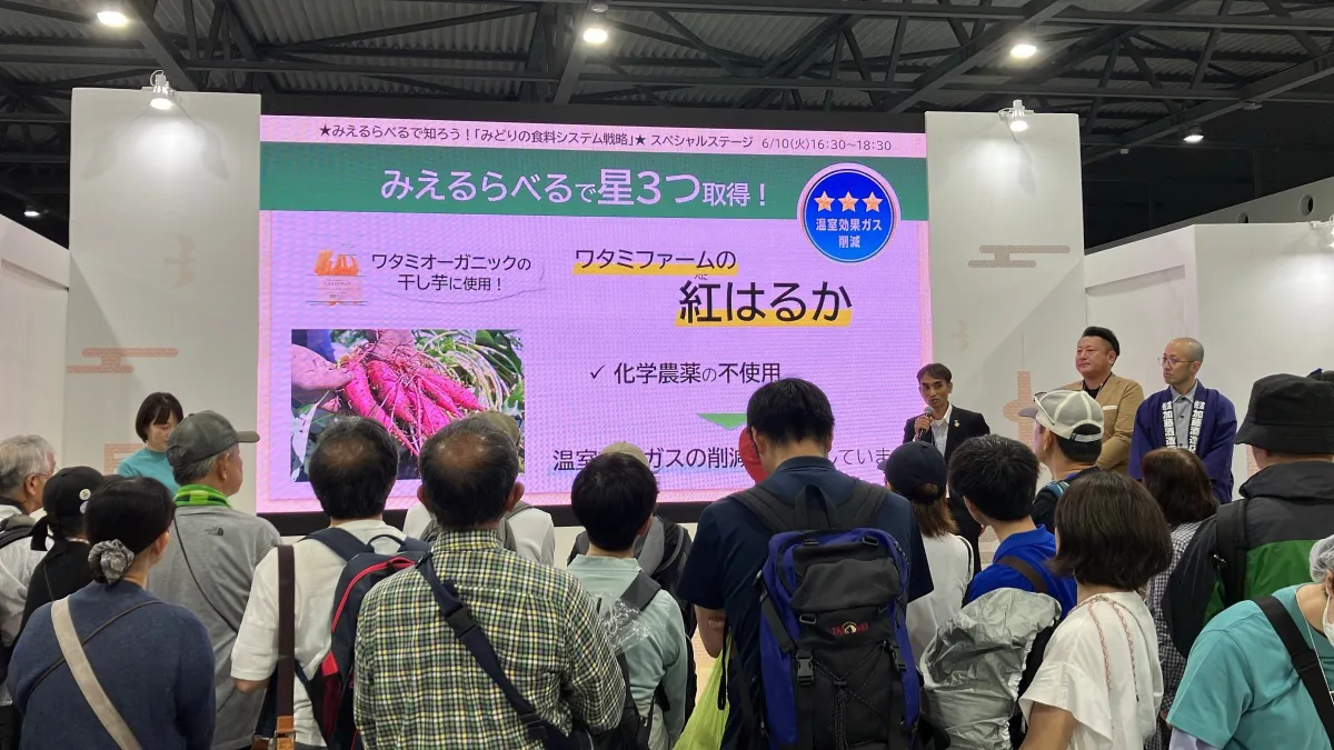 イベント当日、ワタミファームの生産担当者は講演ブースで自社の取り組みを紹介。特に、有機栽培における工夫や、温室効果ガス削減に向けた具体的な事例が取り上げられ、参加者からは新たな知識を得る好機となりました。加えて、三つ星評価を受けた有機野菜を使った「キャロット&オレンジジュース」や「干し芋」が会場で提供され、多くの来場者から高い評価を得たことも見逃せません。