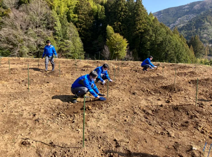寄附の翌日、3月27日には、ぶどう園がある川西路地区に移動し、四国支店の社員4名が一緒に約50本のぶどうの苗木を植えました。このプロジェクトでは、収穫が3年後に期待されており、最終的には年に1,000本のワイン生産を目指しています。ワイン用のぶどう苗木(品種:ブティ・マンサン)を植える作業は、参加した社員にとっても新たな経験と学びの場となりました。