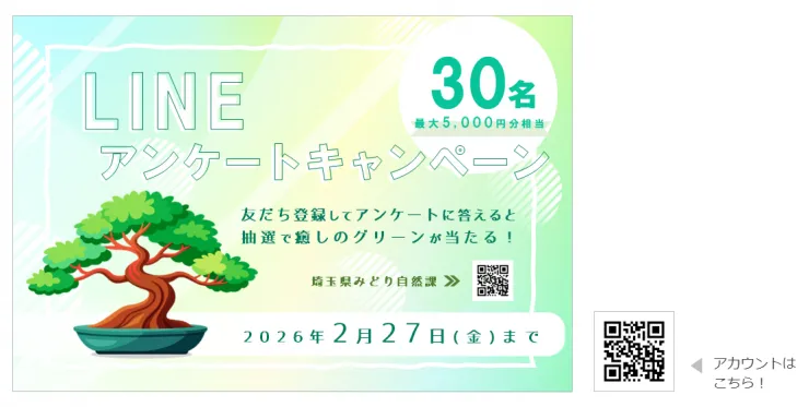 参加はとても簡単です。すでに「埼玉県みどり自然課」のLINE公式アカウント(@906nauaa)を友だち追加した方は、リンクを通じてアンケートにアクセス可能です。アンケートにお答えいただいた方の中から、抽選でいくつかの特典が当たります。