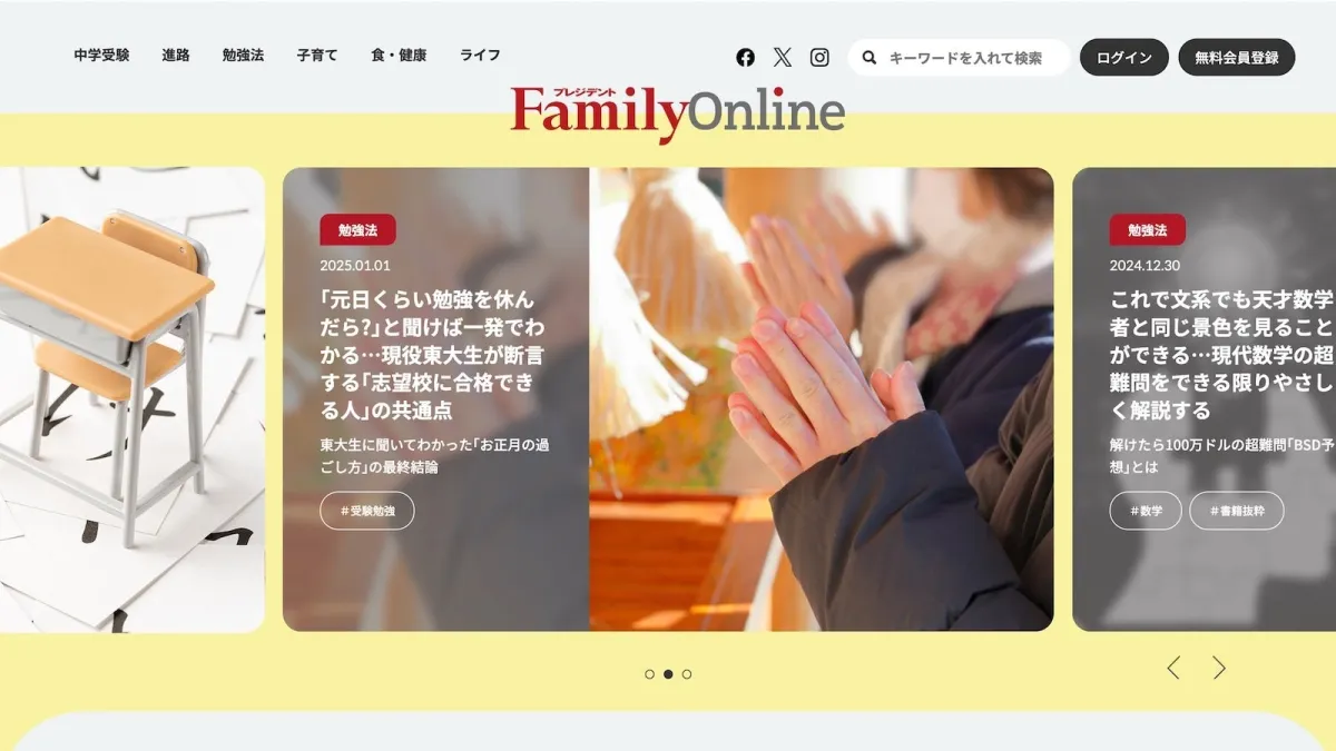 「プレジデントFamily Online」は、塾や習い事、英語教育、算数、中学受験、小学校受験、さらには医学部進学に関する最新の教育事情や受験トレンドを一覧にし、より詳細に深掘りしていきます。その一方で、食育や健康、レジャー、生活環境といった家庭生活を豊かにするための情報も豊富に取り揃えています。お子さんの成長を楽しみながらも、課題に直面している家庭をしっかりとサポートする内容となっています。
