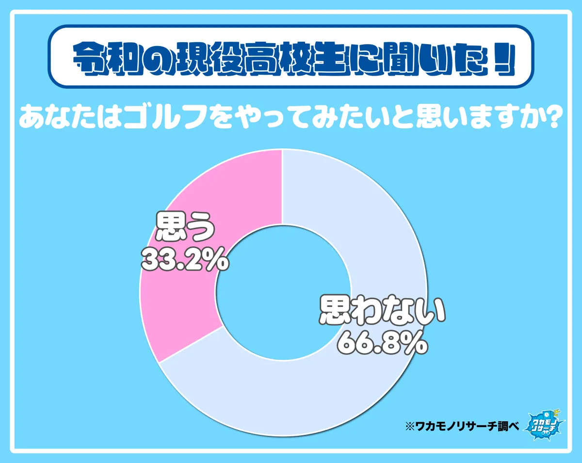 調査に参加した全国の現役高校生に、「あなたはゴルフをやってみたいと思いますか?」と質問したところ、「やってみたいと思う」との回答はわずか33.2%でした。一方で、66.8%の学生が「やってみたいと思わない」と答えたのです。この結果は、若者の間でゴルフに対する関心が薄いことを示しています。
