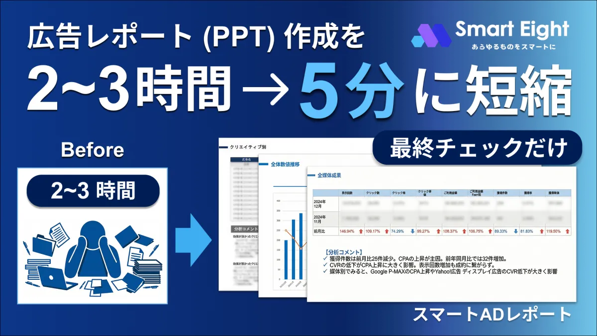 株式会社スマートエイトが新たに提供を開始した「スマートADレポート」は、広告運用の効率化を実現するAIサービスです。Web広告や求人広告代理店向けに設計されており、運用データから自動的にレポートを作成します。このサービスでは、「グラフ」「分析コメント」「改善方針」から提出用のPPTまで、一括して自動生成できるため、広告代理店の業務を大幅に簡素化します。