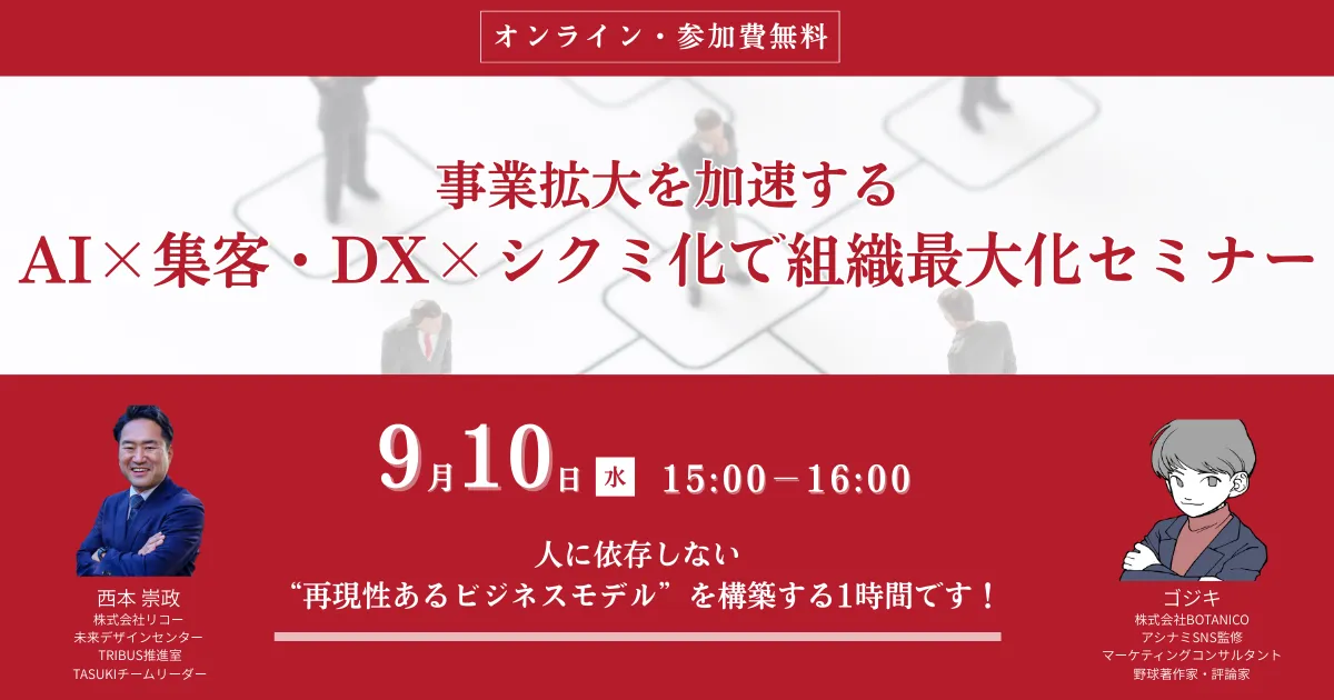 2025年9月10日(水)に、株式会社リコーと株式会社BOTANICOの共催によるセミナーが開催されます。このセミナーは、「AI×集客」と「DX×シクミ化」に焦点を当て、組織の再現性を高め、成長を促進するための新しいアプローチについて深く掘り下げる内容です。