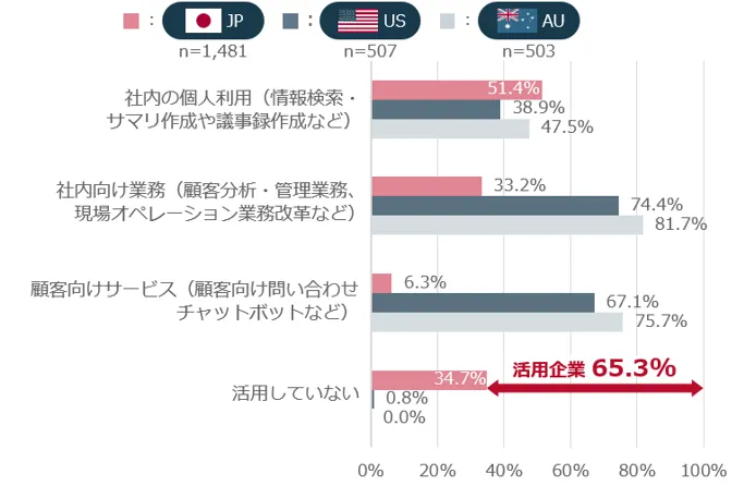 調査によると、日本企業の生成AI活用率は65.3%に達しましたが、その活用方法に明確な違いが見られました。日本では社内での個人利用が過半数を占め、顧客向けサービスとしての導入はわずか6.3%のみでした。対照的に、米国とオーストラリアでは社内向け業務や顧客サービスでの利用がより広範囲にわたっていることが示され、日本企業の活用方法には制限がかかっている可能性があります。