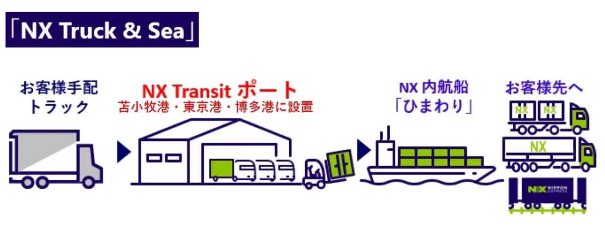 「NX Truck & Sea」は、苫小牧港、東京港、博多港に設置された積替え施設「NX Transit ポート」を活用します。顧客からトラックやその他の手段で持ち込まれた貨物は、海上コンテナやトレーラーに積替えられ、内航船「ひまわり」を利用して海上輸送が行われます。その後、目的地までの配達が行われる仕組みです。これにより、長距離トラック輸送の必要がなくなり、運送業界で深刻な問題となっている労働力不足の解消に寄与します。