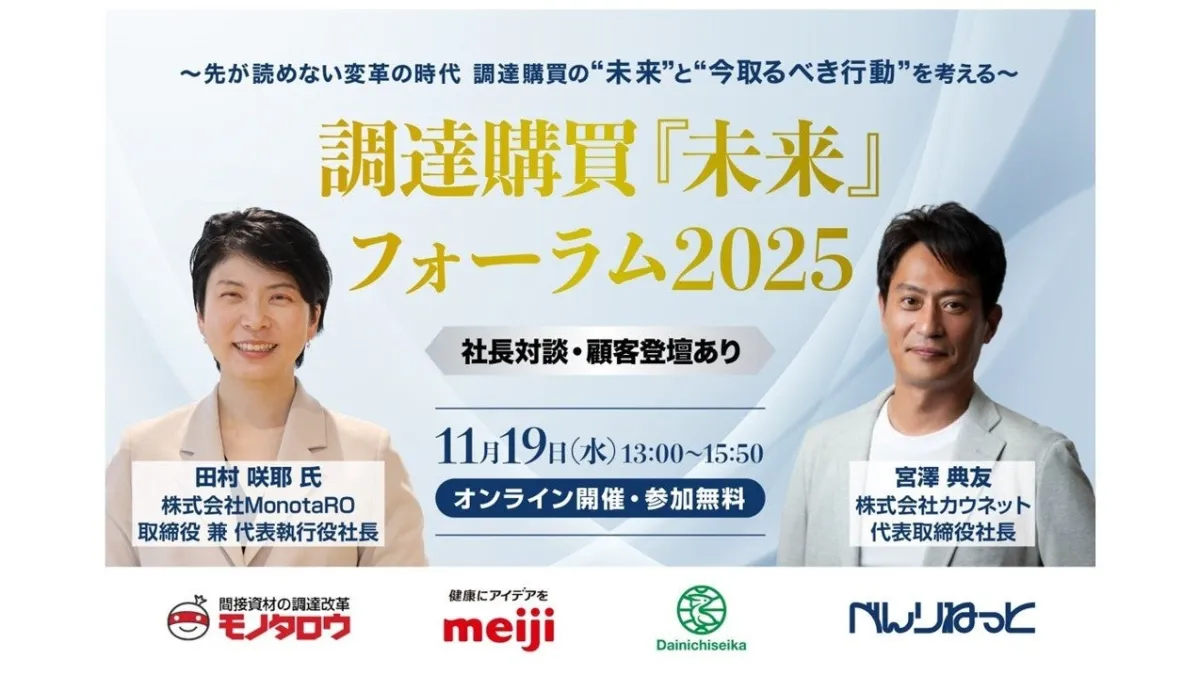 2025年11月19日(水)、カウネットとMonotaROが主催するウェビナー「調達購買『未来』フォーラム2025」がオンラインで開催されます。このイベントでは、調達購買の現在と未来についての具体的なビジョンが語られ、参加者に向けて新たな道筋が示される予定です。