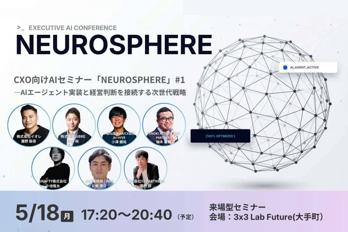 2026年5月18日(月)、株式会社NEUROSPHEREが主催するAI実装戦略カンファレンス「NEUROSPHERE」が東京・大手町の3×3 Lab Futureで開催されます。このイベントは、経営者や意思決定者を対象としたAIエージェントの実装と経営判断の接続をテーマに掲げ、企業の変革を加速させるための実践知を共有することを目指しています。