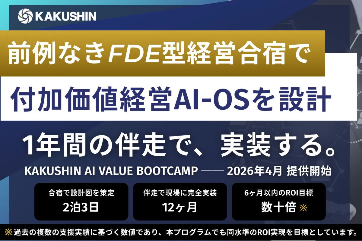 「多くの日本企業が未使用のSaaSや形骸化した外注契約にコストを払い続けています。私たちが『KAKUSHIN AI VALUE BOOTCAMP』で目指すのは、AI技術を単に導入することではなく、それを支える経営構造をしっかり設計し、実装することです。日本企業が高収益・高賃金構造へと移行する手助けをすることが、私たちの使命です。」