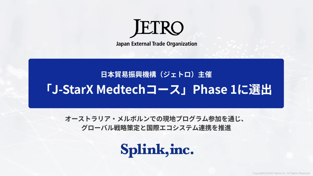株式会社Splinkが、日本貿易振興機構(ジェトロ)が主催する「J-StarX Medtechコース」のPhase 1に選出されました。このプログラムは、豪州発の医療ヘルスケア専門アクセラレーターである「Medtech Actuator」と連携し、製品のグローバル展開戦略を構築することを目指しています。