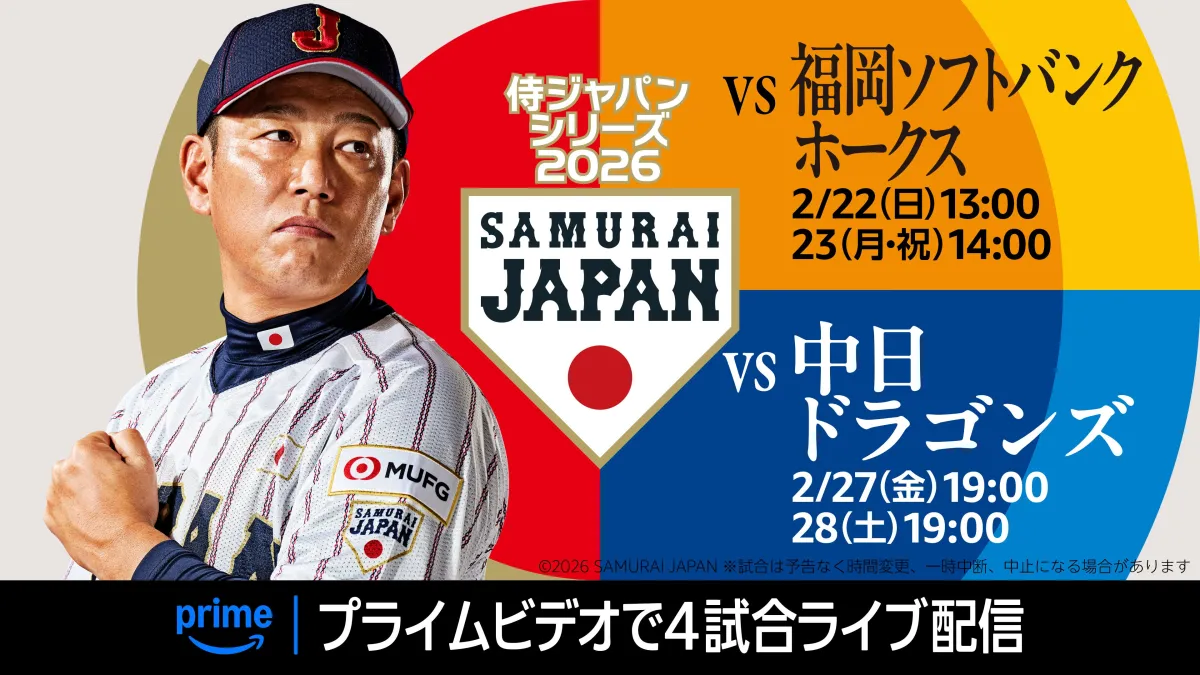 Prime Videoは、2026年に開催される「WORLD BASEBALL CLASSIC™」に向けた準備として、侍ジャパンの強化試合をライブ配信することを発表しました。2026年に向けた重要な前哨戦となるこの試合は、福岡ソフトバンクホークスとの対戦が2月22日と23日に宮崎で行われ、続いて中日ドラゴンズとの試合が2月27日と28日に名古屋で予定されています。これらの試合は地上波では放送されず、Prime Videoでの独占ライブ配信となります。