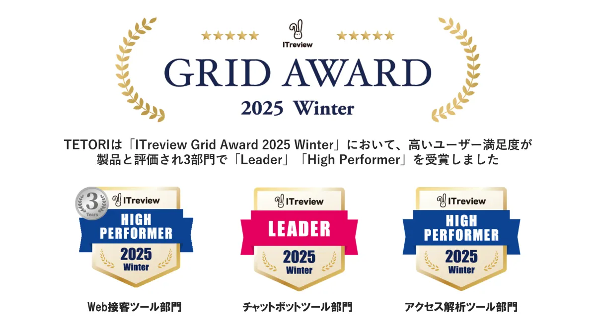 「ITreview Grid Award」は、法人向けのソフトウェアやクラウドサービスに対するユーザーの口コミを元に、四半期ごとに評価を行う賞です。TETORIは、「Web接客ツール部門」および「アクセス解析ツール部門」で「High Performer」、「チャットボットツール部門」で「Leader」の称号を獲得しました。