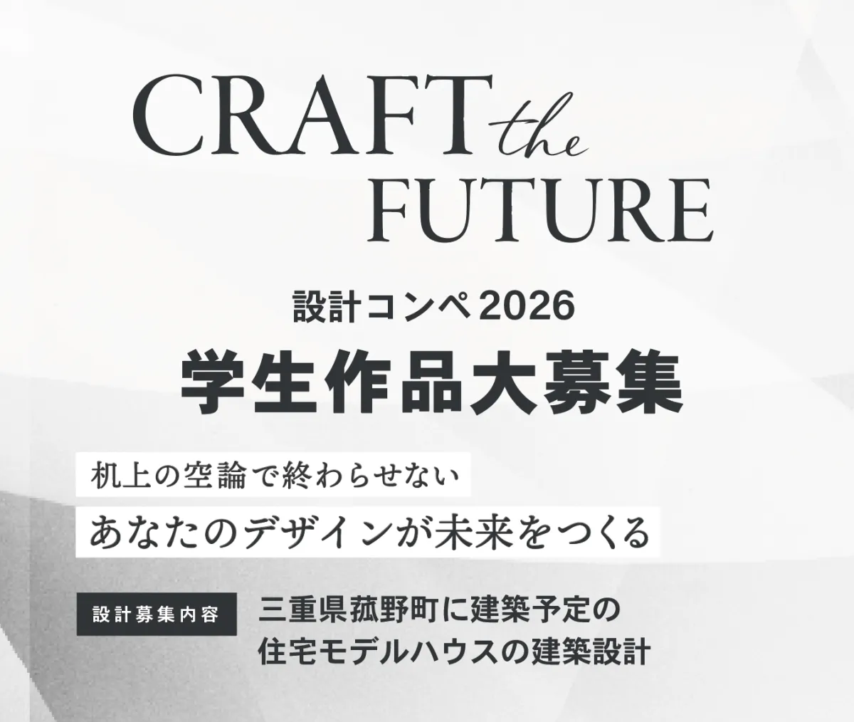 ハウスクラフト株式会社が主催する設計コンペ、「Craft the Future 2026」がスタートします。このコンペは、全国の建築志望の学生を対象に、実際にモデルハウスを設計するというユニークな機会を提供します。最優秀賞に選ばれた作品は、三重県菰野町に実際に建てられるため、デザインが現実のものとなる貴重な経験を得られます。