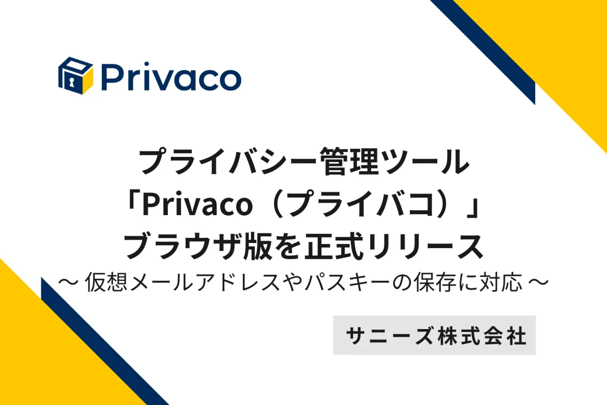 サニーズ株式会社は、このたび自社開発のプライバシー管理ツール「Privaco」のブラウザ版を正式にリリースしたことを発表しました。このツールは、パソコンやスマートフォンのブラウザを使って、さまざまなWebサービスのパスワードやメールアドレスを安全に管理するものです。特に、PC版ではGoogle Chrome拡張機能が搭載されているため、サービスの登録やログインが非常にスムーズに行えます。
