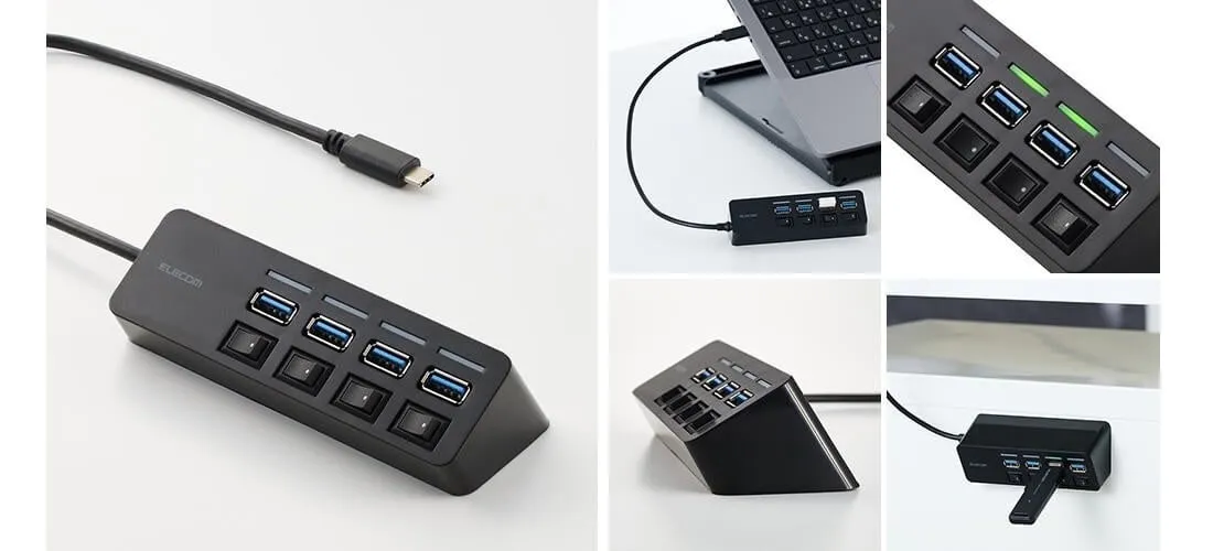 このUSBハブの特長は、各ポートにON/OFFスイッチが付いている点です。これにより、必要なときだけ電源を入れ、無駄な電力消費を防ぐことができます。また、各スイッチにはLEDランプが設置されており、電源のON/OFF状態を視覚的に確認できるため、使い勝手も向上しています。